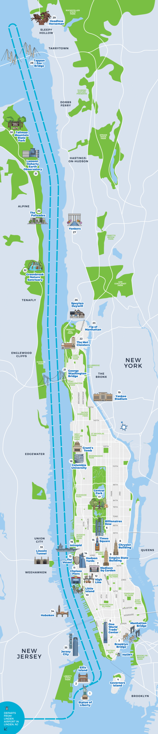 Departing from our Linden, NJ location you’ll head directly to the Statue of Liberty for amazing views of the Manhattan skyline. Heading north past the One World Trade Center you’ll fly the full length of Manhattan passing by neighborhoods including Chelsea to see Little Island and Midtown with its iconic landmarks the Empire State Building, Madison Square Garden and newer sights like Hudson Yards and the Vessel. You’ll pass the Upper West Side to see Central Park and Northern Manhattan to fly over the George Washington Bridge before turning around and heading back to New Jersey.